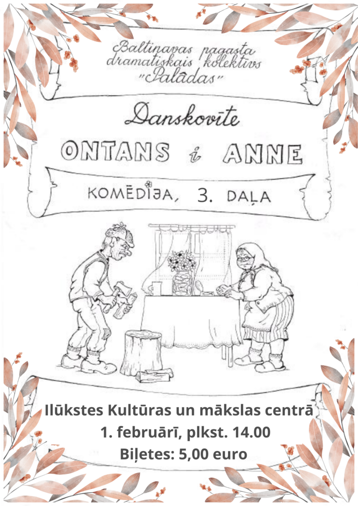 Sākums Pasākumi Komēdija “Danskovīte” Kultūra Datums 1. februāris, 2026. Laiks 14:00 Ilūkstes Kultūras un mākslas centrs Brīvības iela 12, Ilūkste